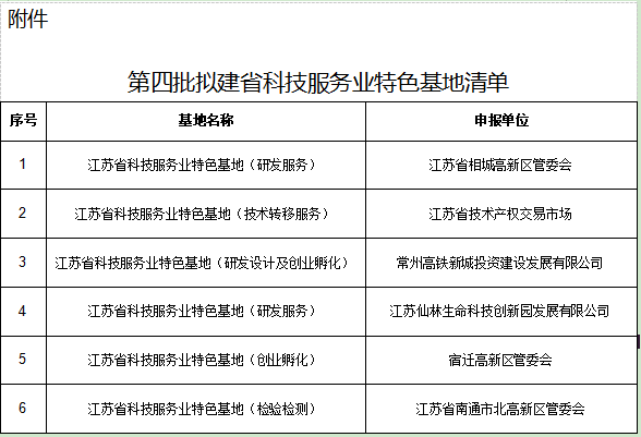 根據(jù)省政府辦公廳《關(guān)于印發(fā)加快科技服務(wù)業(yè)發(fā)展實(shí)施方案的通知》(蘇政辦發(fā)〔2015〕126號(hào))的要求,省科技廳會(huì)同省有關(guān)部門(mén)確定了第四批擬掛牌建設(shè)的省科技服務(wù)業(yè)特色基地,現(xiàn)予以公示。公示時(shí)間自2020年9月16日至9月22日,為期7天。