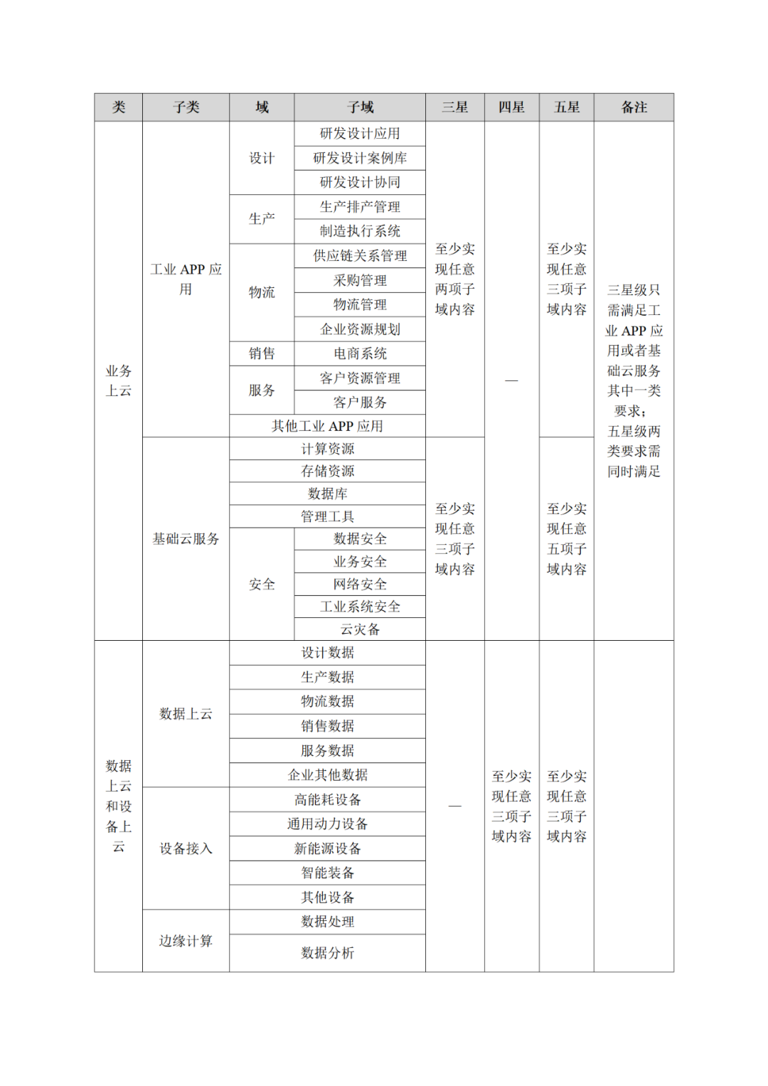 根據(jù)企業(yè)業(yè)務(wù)上云、數(shù)據(jù)上云和設(shè)備上云、企業(yè)上云成效,評定企業(yè)上云的星級。具體如下表所示。