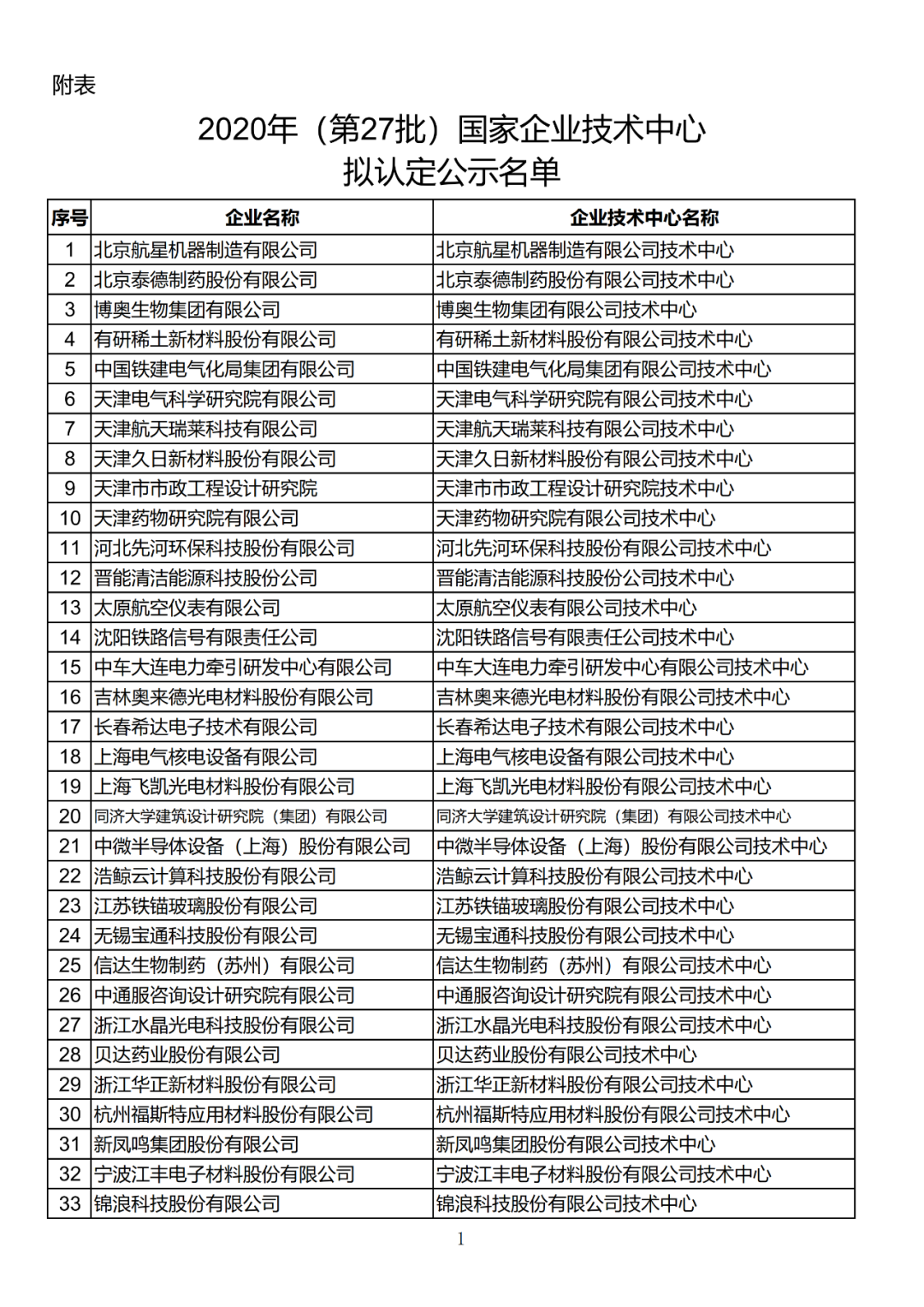 附 表:2020年(第27批)國(guó)家企業(yè)技術(shù)中心擬認(rèn)定公示名單